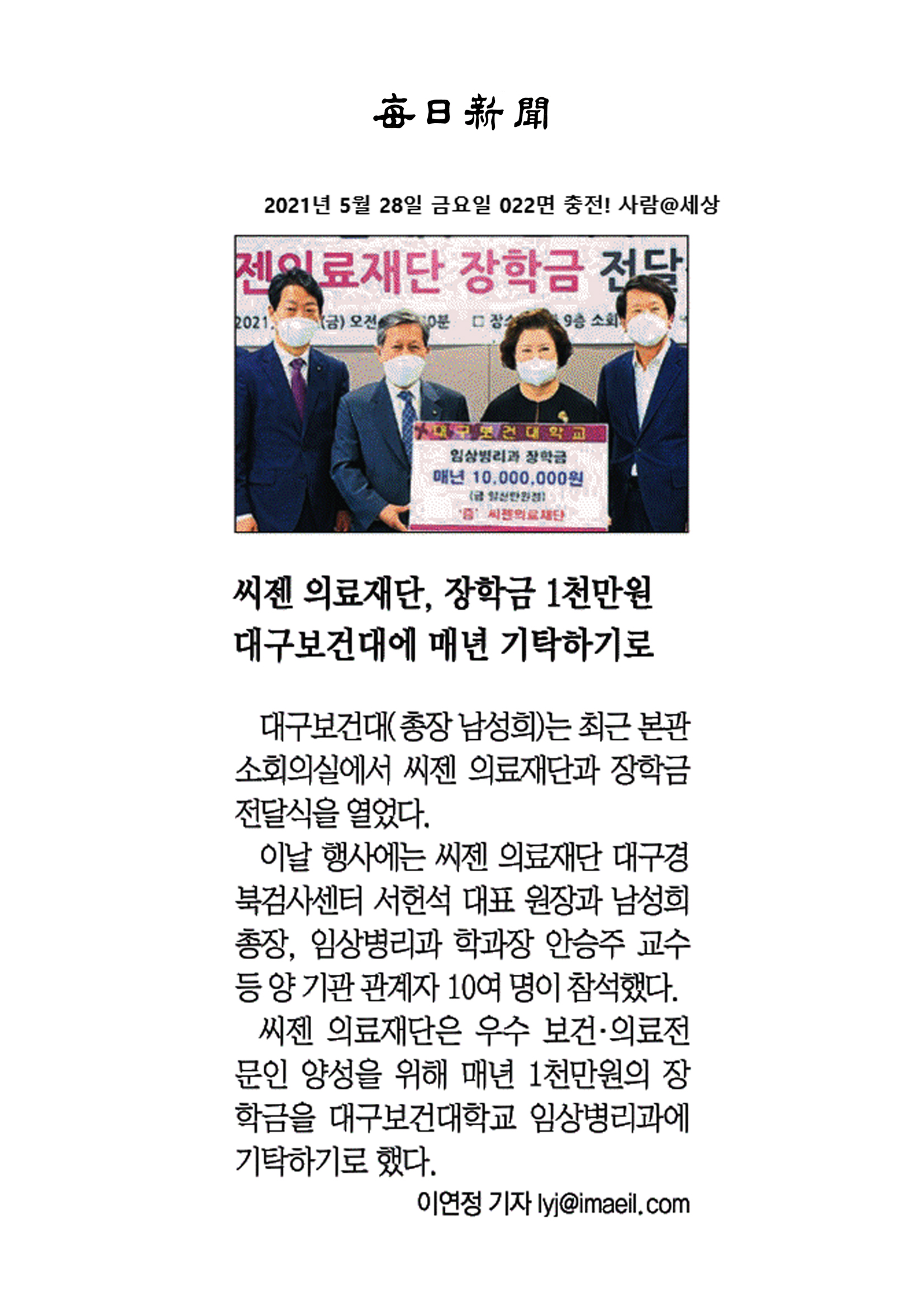 씨젠 의료재단의소중한 장학금 10,000,000원 매년 기탁에 진심으로 감사드립니다.
